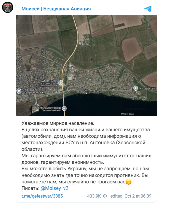 В украинском канале «Тиск» рассказывают, что ВС РФ ввели в городе «красную зону», где атакуют любые транспортные средства, а более «серьезные» цели поражают артиллерией и авиабомбами с модулем УМПК, не считаясь с потерями среди гражданских. Россияне тем временем сами демонстрируют кадры, например, «сброса» на автомобиль Управления верховного комиссара ООН по делам беженцев. Удары по мирному населению подтверждает и известный российский оператор дронов с позывным Моисей, требуя от местных жителей выдать им позиции ВСУ, чтобы сохранить жизни и имущество.