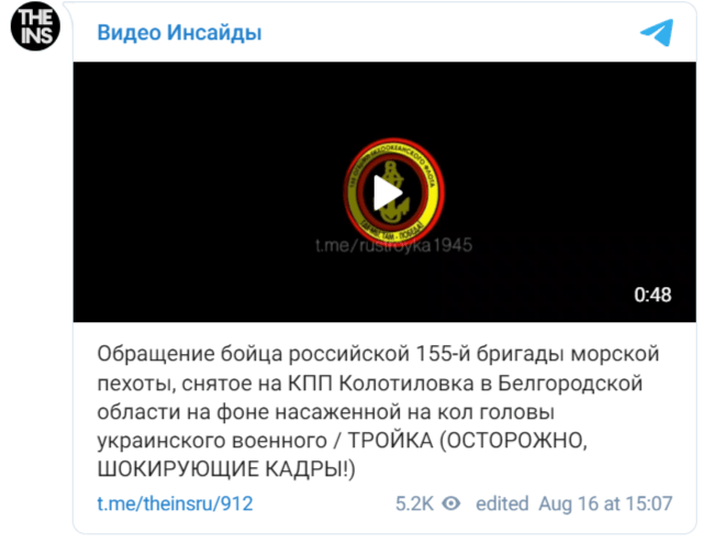 Несмотря на это, Z-авторы охотно оправдывают расстрелы, а, например, в неонацистском формировании «Русич» открыто к этому призывают. Это и неудивительно — расследовательский проект Bellingcat приводил убедительные доказательства, что именно руководитель группировки Алексей Мильчаков был запечатлен с отрезанной головой на фотографии, снятой в Сирии. Если подобные издевательства над убитыми раньше были присущи в основном «Русичу» и «Вагнеру», то сейчас к ним присоединились и регулярные российские части — на видео 155-й ОБрМП из Белгородской области фигурирует, вероятно, голова украинского военного, насаженная на шест. Еще одного украинского военного со связанными скотчем руками пронзили мечом с надписью «за Курск» — причем это произошло вовсе не в Курской области, а в недавно оккупированной Новогродовке в Донецкой области.